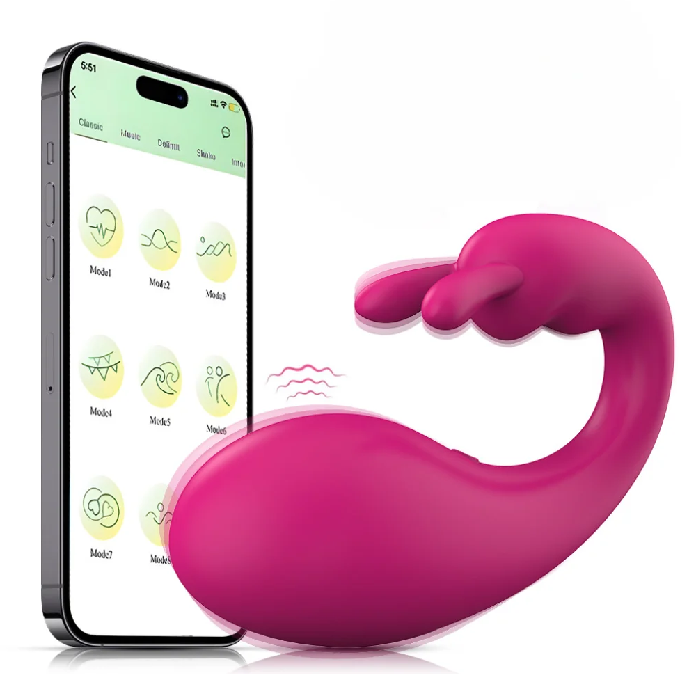 Vibrador ponto G com estimulador clitoriano, controlado por aplicativo. Possui múltiplos modos de vibração, design ergonômico, material seguro para o corpo e é resistente à água. Ideal para uma experiência personalizada e intensa.